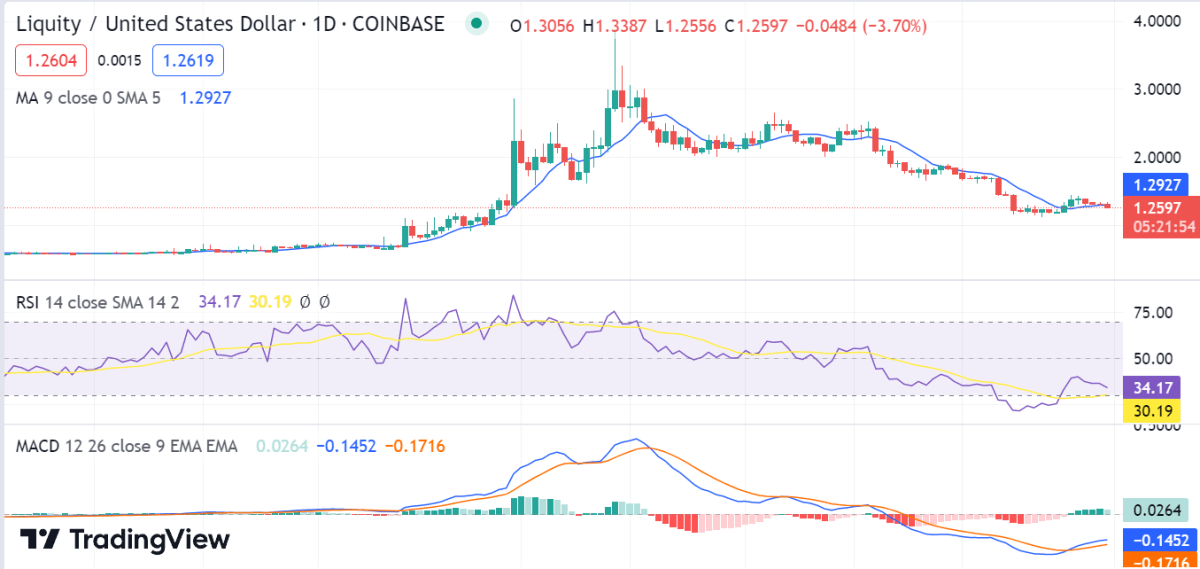 Liquity price analysis is bearish today as the market is in a downward trend. The price has been decreasing over the past 24 hours, and it looks like this trend will continue in the near future. The bears are in control of the market, and it’s likely that we will see further declines as the day progresses. The price is currently below the $1.26 level, with a decrease of 3.79% at the time of writing. It is important to note that while LQTY prices may be bearish right now, there is still potential for a rebound in the near future. Traders should watch closely for any signs of upside momentum before entering into any positions.