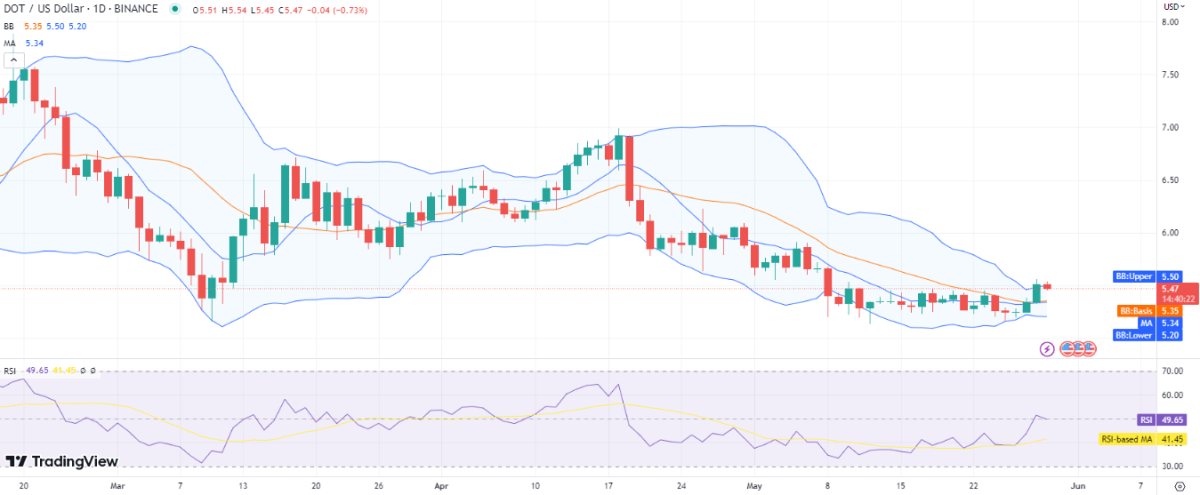 The volatility is low as the Bollinger bands have converged, and the price is trending near the upper limit of the Bollinger bands today. The upper band at the $5.50 level represents resistance for DOT, and the mean average line of the indicator at the $5.35 mark, represents a support zone for DOT. The relative strength index (RSI) shows a downward curve, hinting at the selling activity in the market as it trades at index 49.