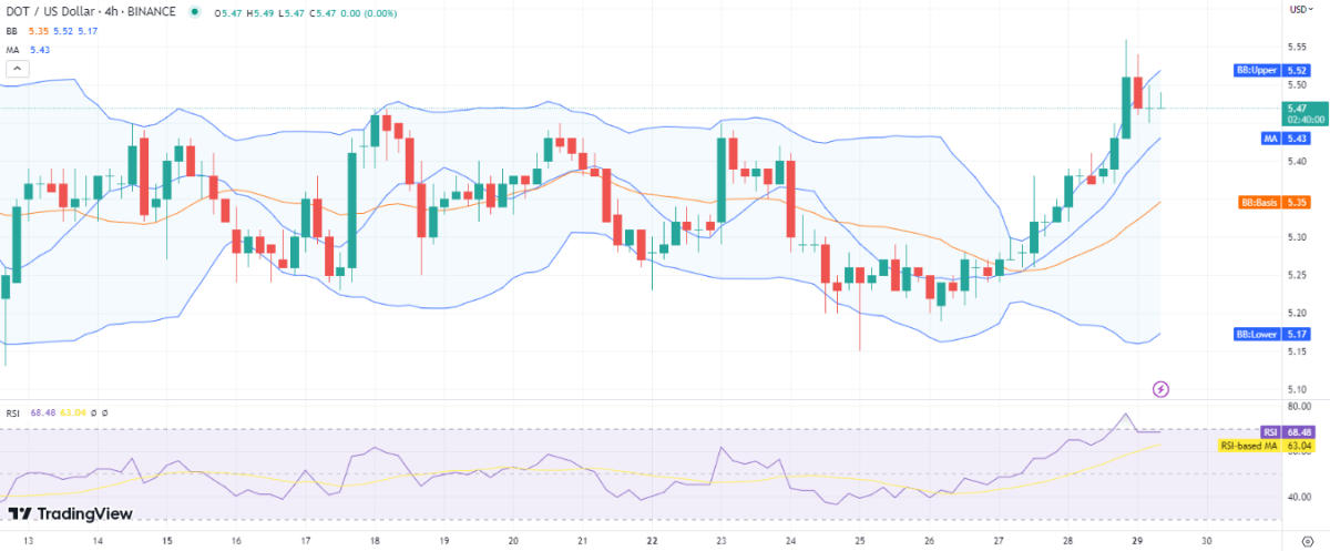 The volatility on the 4-hour chart is also high, with the upper limit of the Bollinger bands at $5.52 representing resistance for the coin and the lower limit at the $5.12 mark. The average of the indicator represents support for DOT at the $5.35 mark. The RSI is on a flattened slope at index 68, after stepping into the neutral range, but the coin is not in an overbought position here as the RSI is trading in the neutral zone.