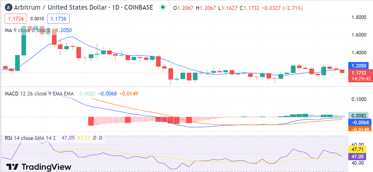 Arbitrum price analysis is bearish with bears being in control of the market for the past 24 hours. If the bears break below $1.16, then ARB/USD will likely fall to the $1.11 support level. However, bulls could cause a pullback above the $1.23 resistance if they regain control of the price. In any case, traders should remain patient and wait for a clear trend reversal before entering the market.