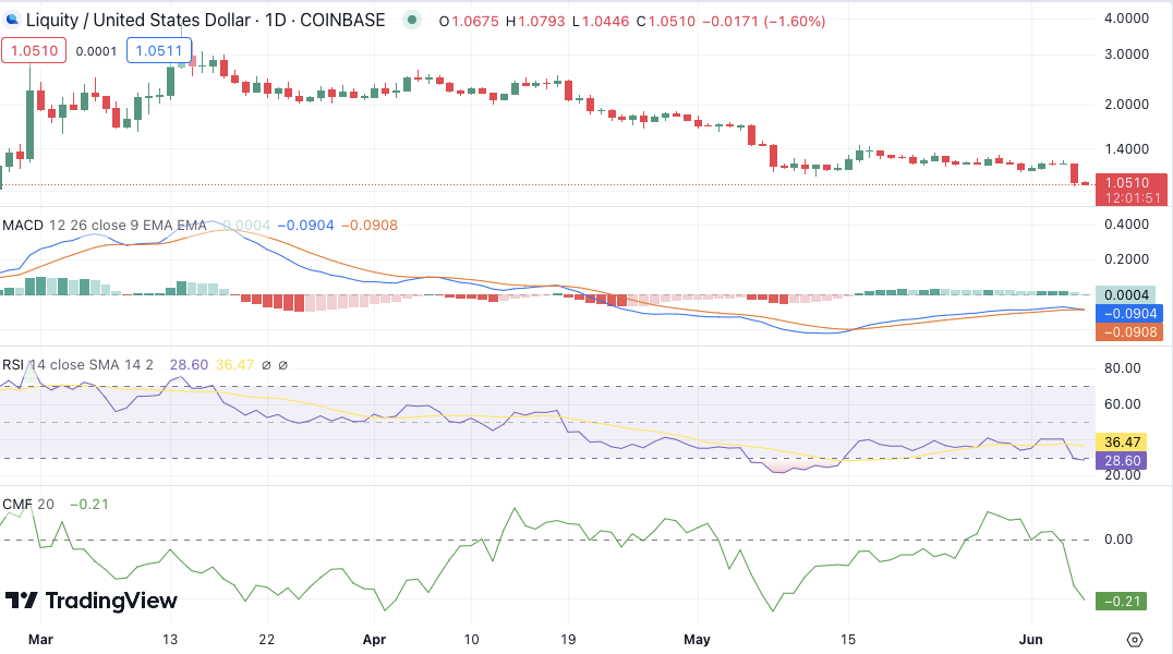 Overall, LQTY’s bearish trend is likely to continue in the near term. The price may remain stuck between the support at $1.03 and resistance at $1.21 without any sign of a trend reversal or breakout. A break below the support could lead to further losses for LQTY, taking it down toward its next major support level at $0.95.