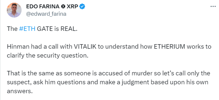 This, according to a number of critics, influenced Hinman’s decision not to designate Ether (ETH) as a security. Numerous Twitter users have accused the SEC of favoring Vitalik Buterin and the Ethereum crypto. This alleged collusion is referred to as #EthGate by XRP holders and their supporters.