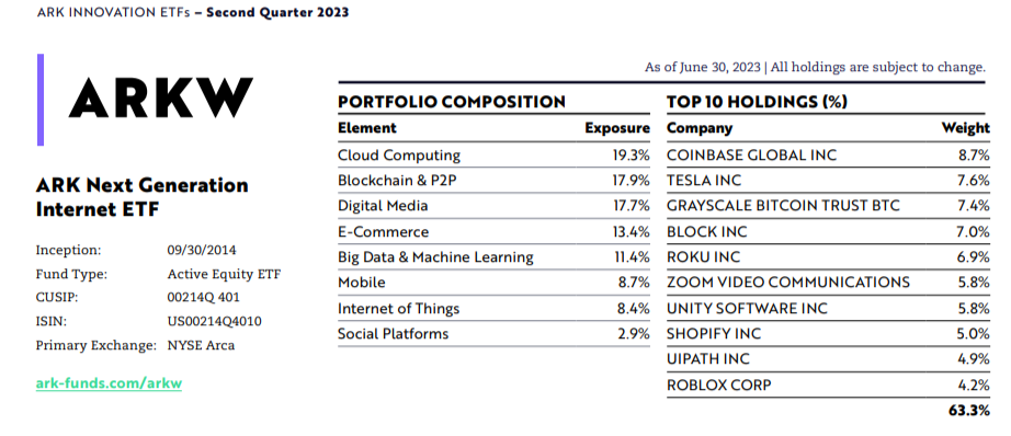 - Grayscale BTC Trust shares accounted for approximately 7.5% of total ARKW holdings in Q2 2023, roughly the same amount as Tesla.