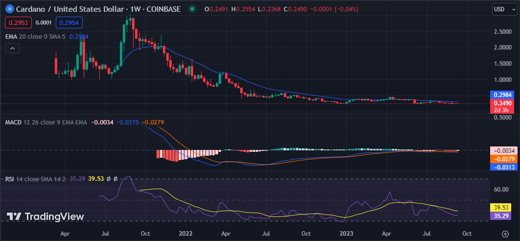 According to the recent crypto price analysis, ADA has been trading between $0.2300 and $0.2500 over the past week, with bulls and bears struggling for dominance. The selling pressure has been dominating the market, with bears in control. The price is currently trading at $0.248 as of this writing, with a 24-hour decrease of 0.62% and a 7-day decrease of 1.65%.