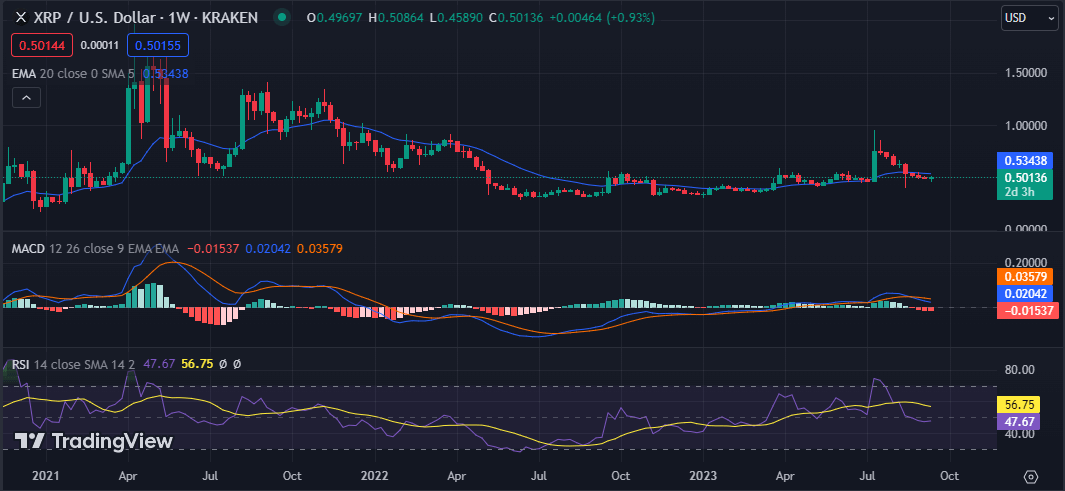 According to the weekly crypto price analysis, the XRP has been trading between $0.4600 and $0.500 for most of the week, with sideways movement. The bearish pressure has risen, with the coin failing to break above 0.5100 levels. The token has decreased by 0.62 percent in the past seven days and is currently trading at $0.5011 as of this writing.